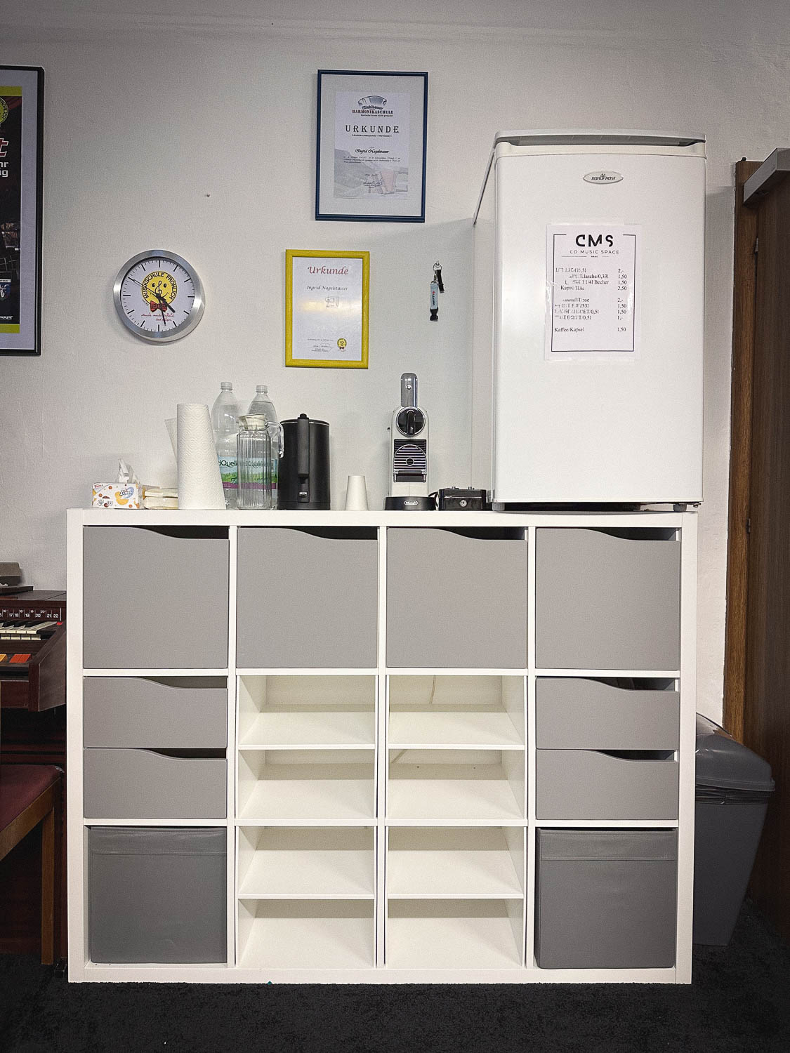 Von Notenständer bis Flipchart, von Schlagzeug bis Keyboard, von verschiedensten Verstärkern und Boxen bis Mischer und Mikrofonierung, von klappbaren Tischen bis Kaffeemaschine, Kopierer und WLAN… und vor allem viel Platz, findet man hier alles, was zum Musizieren gebraucht wird!